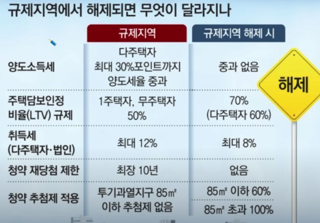 정부랑 금융 당국에서 약간 놓친 게 뭐냐면 결국에는 이 집값을 반등시키려면 또는 집값 하락 폭을 줄이려면 매수자가 움직여야 합니다. 수요자가 움직여야 집값 하락이 줄어드는데 규제가 풀리면 어떤 혜택이 있나 봤더니 결국은 매도자가 좀 유리한 혜택입니다. 표를 보면 양도소득세 최대 30%까지 중과되던 것이 없어집니다. 당연히 매도자에게 좋습니다. 그리고 주택담보 비율 LTV 규제가 완화되죠 제 1주택자랑 무주택자는 규제지역에서 40~50% 정도밖에 못 받는데 규제가 해제되면 대출이 70%까지 나옵니다. 이거는 매수자가 좋은 거 아니에요.