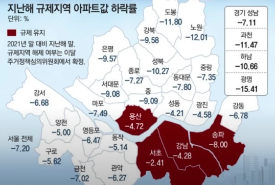 2022 작년도 집값 하락률을 보여주는 이미지입니다. 빨간색 부분이 규제 유지 지역입니다. 서울에 평균 집값 하락률이 7% 정도 됐었는데 단순히 하락률이 낮았기 때문에 이곳의 규제를 풀지 않는다. 그렇게 보기는 어렵고요 수요가 살아있다고 보고 있는듯 합니다. 만약에 강남과 용산 같은 경우에는 대출이 풀리거나 규제가 풀리게 되면은 그곳에 집을 사고 싶어하는 사람들이 아직은 있다고 판단을 하는 겁니다.