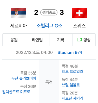 연일 이변과 기적이 벌어지고 있는 2022 카타르 월드컵 한국 대표팀의 16강전을 사용되는 예상대로 브라질로 결정됐습니다. G조 선수들은 마지막 경기에서 뜨거운 승부가 펼쳐졌어요. 브라질이 카메룬의 패배하는 충격을 겪은 가운데 스위스가 세르비아의 승리를 거뒀는데 스위스가 만약에 세르비아의 한 골만 더 넣었다면 우리가 스위스를 1위로 만날 수도 있었거든요. 결국 브라질을 만나게 됐지만, 브라질도 결코 무적은 아니 다라는 게 드러났던 경기였습니다.