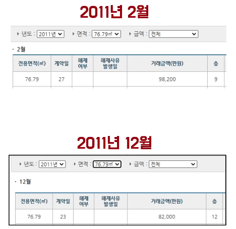 이때 은마아파트하고 잠실 쪽은 5단지 어떤 식으로 움직였을까요? 대표적으로 은마아파트를 보겠습니다. 은마아파트는요 이때도 선행성을 보여주게 됩니다. 2011년 2월에 9억 8200만 원이었던 은마아파트 전용 76 제곱미터는요 2011년 12월 그의 말에 8억 2천으로 1억 6천만 원 급락하게 됩니다. 그리고 나서 1년 뒤에는요 1억 천만 원 정도 하락해요 하락 폭이 2012년부터 2011년이 더 가팔랐습니다 그런데 2012년 12월을 마지막으로 은마아파트는 반등하게 됩니다. 그래서 2013년 5월에는 8억까지 올라가게 되죠!
