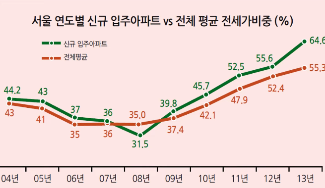 10년 전에 대세 하락장에서 보시면 전세 가격에 정말로 많이 치솟았거든요. 10년 전 대세 하락장에 보면 매매가격 떨어지지만 전세가격이 계속 치솟고 있었어요. 그런데 왜 전세가이 치솟냐? 일단 두 가지 원인이 지목되는 거예요. 장기간 침체의 분양시장이 올 수 없다면서 공급이 줄어들었다는 논리가 있고, 그것도 맞는 이야기인데 또 하나의 이유는요 정비사업장이 2주 때문이에요.