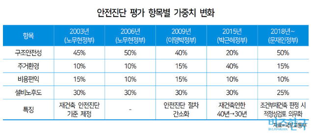 그래서 1월 5일부터 바뀐 내용을 보면요. 일단은 구조안정성 비율이 50%에서 30%로 크게 낮아지고요. 주거 환경 비율이 15%에서 30%를 껑충 뛰어 올라가고, 설비 노후도도 25%에서 30%로 올라가게 됩니다. 그럼 당초에는 무너질 가능성만 있을 때 재건축하게 해줄게 해서 무너질 가능성은 별로 없지만 아파트 추천하는 심각하고 녹물이 많이 나오고 뭐 그리고 누수가 많은 경우에는 재건축을 하게 해주겠다 이런 식으로 방향을 바꾸게 되는 겁니다. 그래서 노후아파트 단지에서 재건축을 원하면 대부분 통과 가능한 수준으로 맞추게 됐다는 거죠.