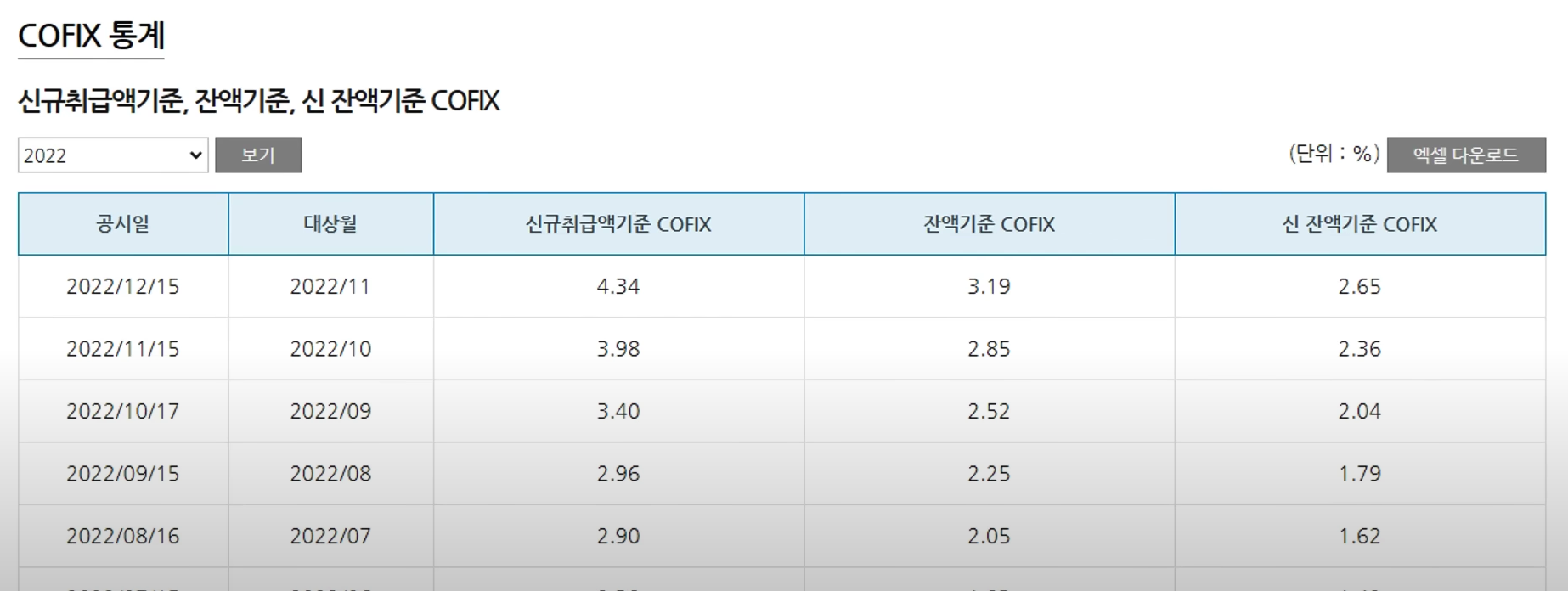 자 근데 많은 사람이 직접 사용하는 주택담보대출이나 전세자금대출 등은요 일반적으로 신규 취급액 기준 코픽스를 기준금리로 삼게 됩니다 이 코픽스 금리는요 월 1일에 은행연합회에서 발표해요. 근데 12월 15일 날 발표됐었던 가장 최근에 신규 코픽스는요 4.34%였거든요. 자이 코픽스 금리가 언제 산출된 것이다? 가장 유동성 위기가 심했다가 2012년 11월 시장 상황을 반영해서 4.34%가 책정됐던 거예요. 근데 현재하고 지금 상황이 많이 다르죠!