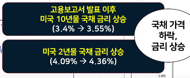 하지만 고용보고서 발표 이후에 5월 금리인상 가능성이 무려 64%까지 지속되게 됩니다. FED 워치에 따라서 원래는 3월달 금리인상 끝으로 더 이상 금리 안 할 거란 베팅이 절대적으로 많았는데, 그것이 크게 바뀌었다는 거죠. 채권시장 특히 국채 시장은요 이런 전망치를 반영을 했습니다. 고용보고서 발표 이후에 미국 10년물 국채 금리가요 3.4%에서 3.5%까지 올라왔구요. 2년물 국제금리도 4.09%에서 4.36%까지 올라가게 됩니다. 자 국제 가격이 하락하면서 국채 금리가 올라갔다는 뜻이에요. 긴축 가능성을 채권시장이 반응하고 있다는거죠.