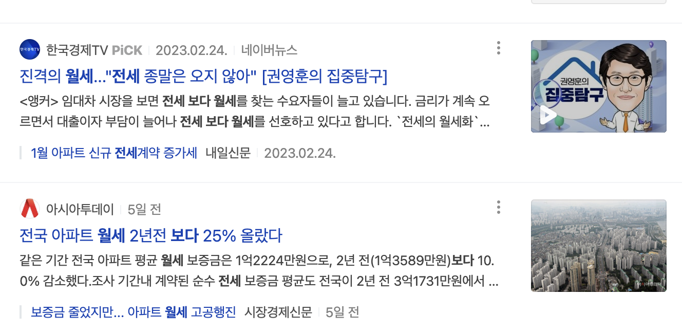 그래서 지금 높은 금리와 전세 불안감 때문에 안정적인 월세 선호 현상이 지금 일어나고 있고, 이게 뭐 아파트 빌라 다 일어나고 있는 상황이다 보니까 반대로 빌라를 가지고 있는 분들 입장에서는 그냥 원래 안정적으로 전세를 줘도 같은데 전세입자들이 구하기가 힘드니까 또 그것도 또 나름 또 힘든 거죠.