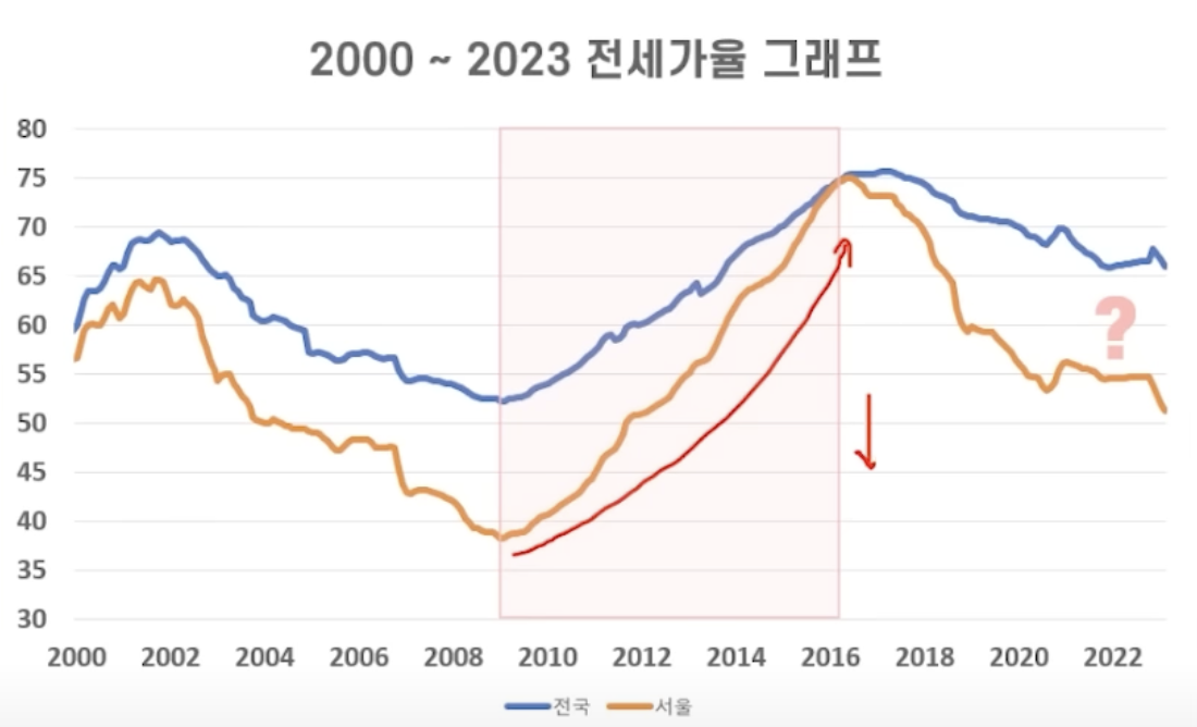 그래서 원래 이 전세와 매매는 반대로 움직이는게 좀 상식적인 일 아니겠어요? 기본적으로 사람들이 매매로 집을 사거나 아니면 매매로 집을 사기 싫으면 전세로 가거나 이렇게 서로 그 상반된 움직임을 보이는게 매매와 전세인데 이게 지금 조금 이상하게 가는 거죠. 요게 2000년도부터 2023년까지 전세가율 그래프입니다.